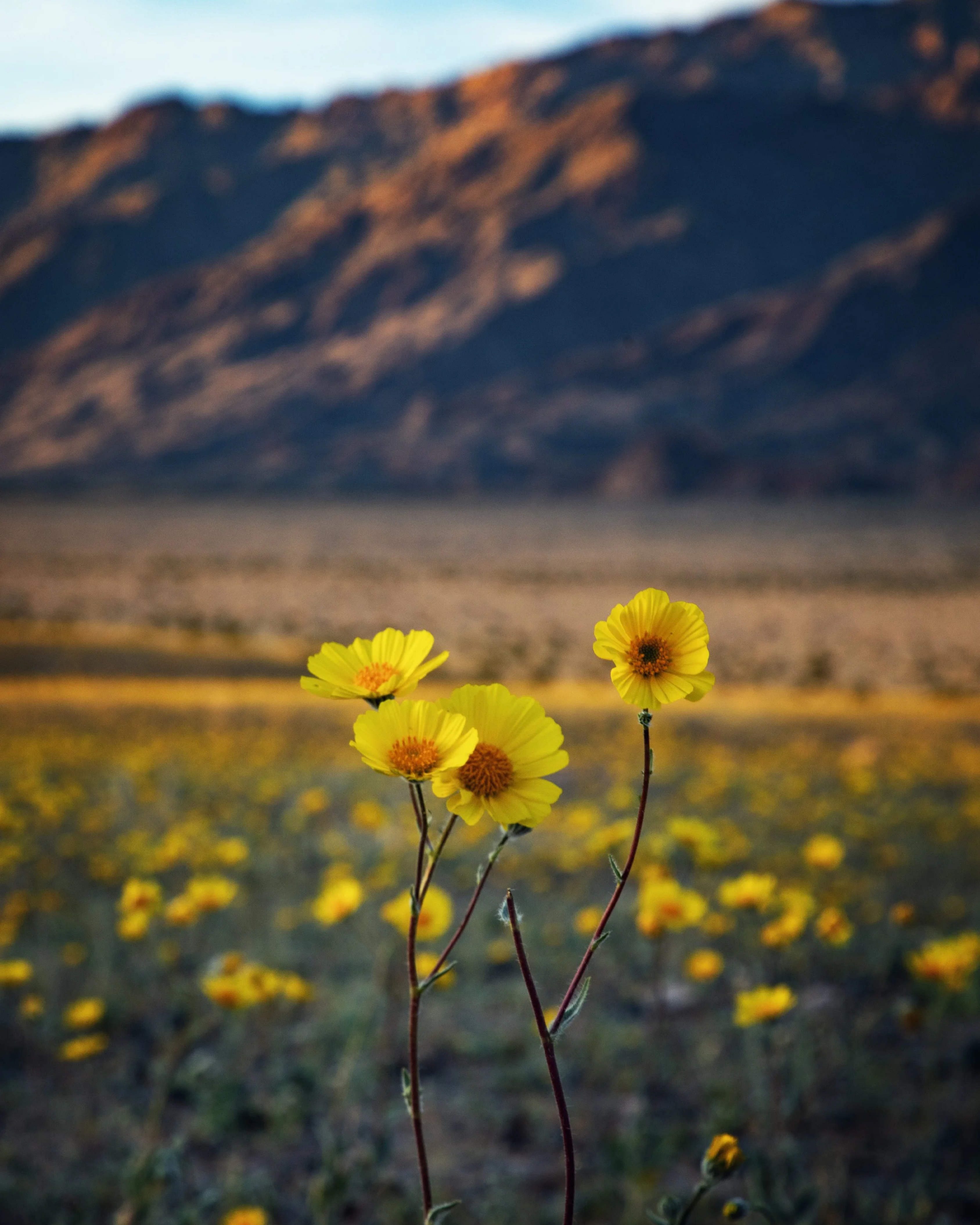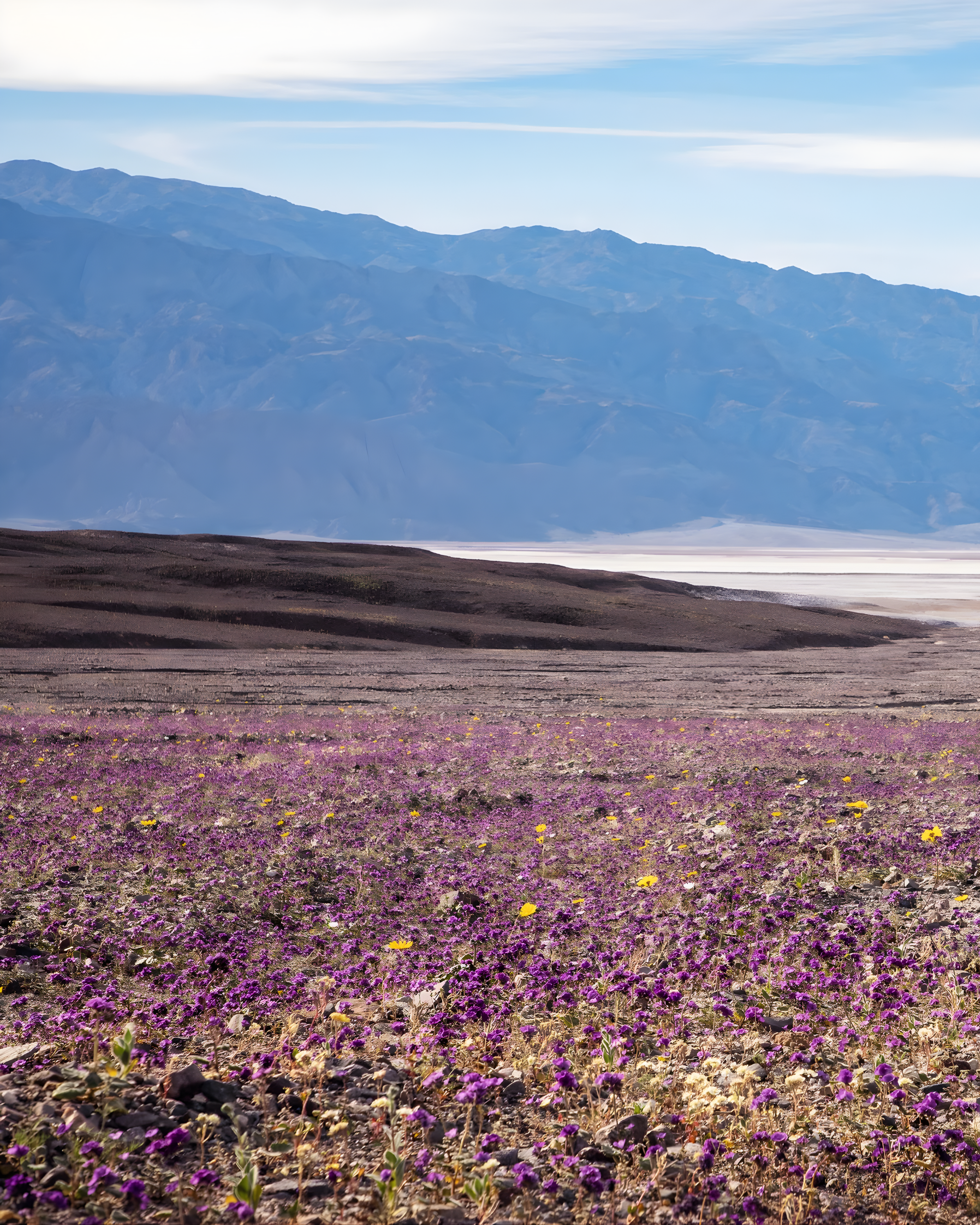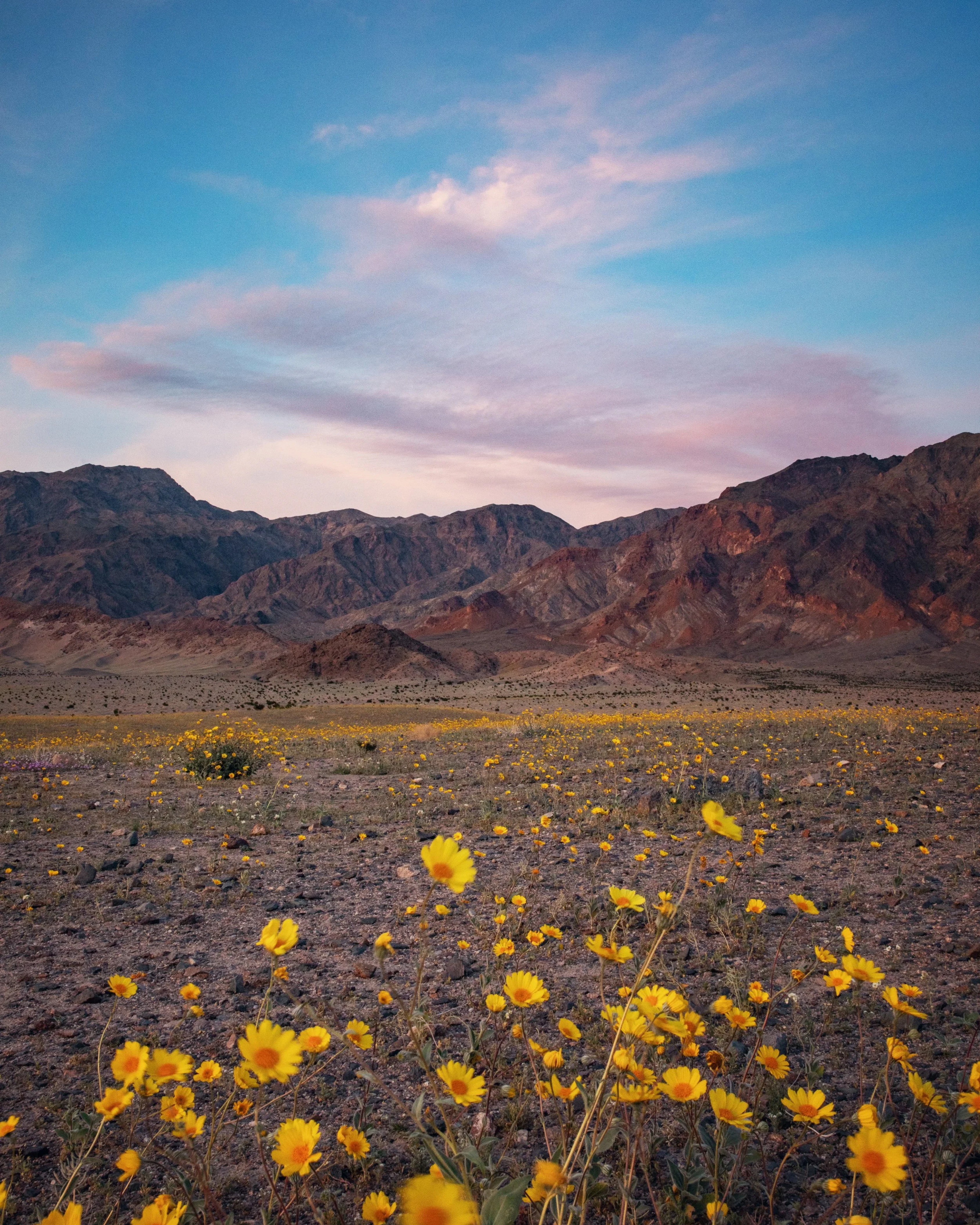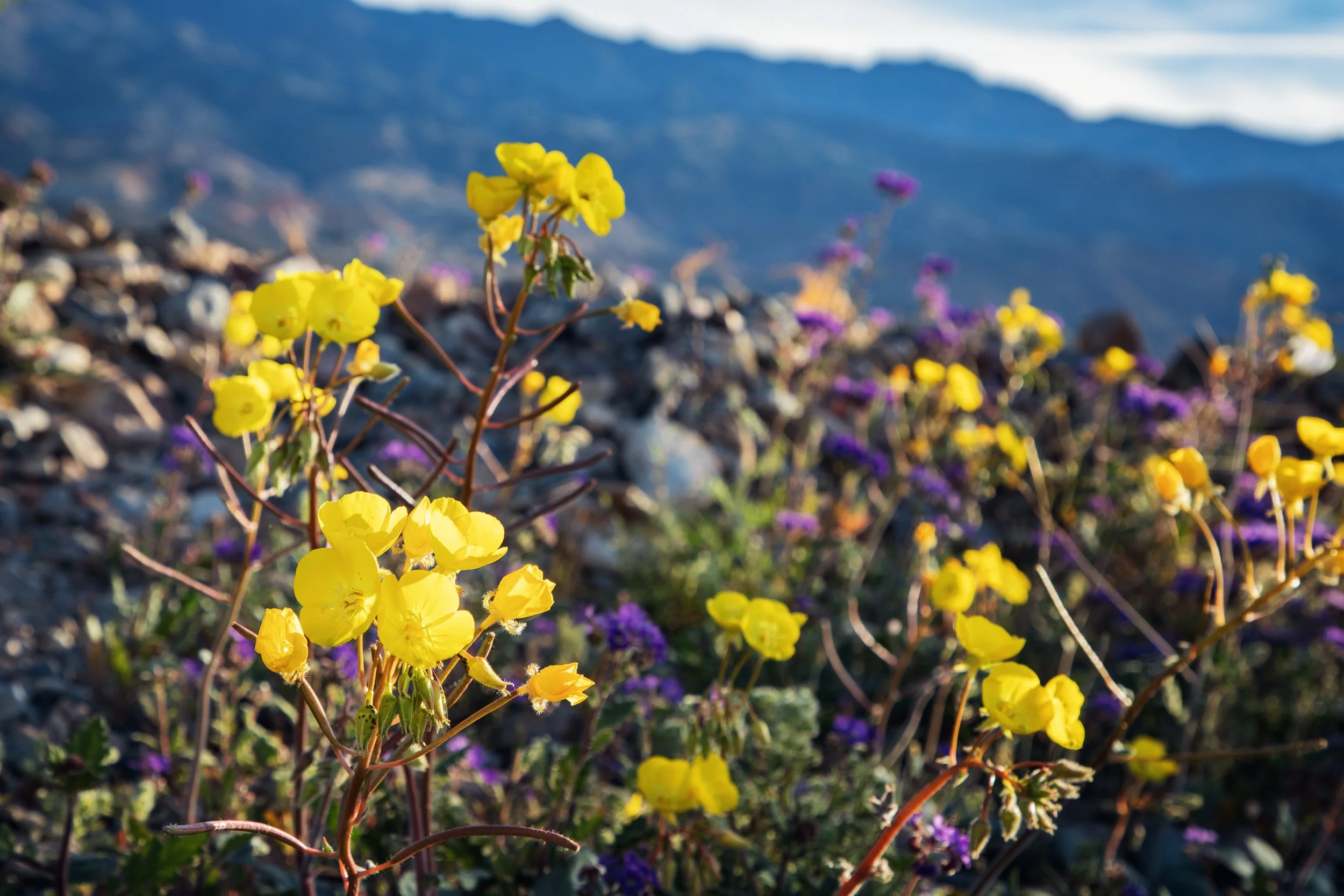 During peak bloom, the desert shifts from muted tones to wide fields of yellow, purple, pink, and white. Some of the most common flowers include: